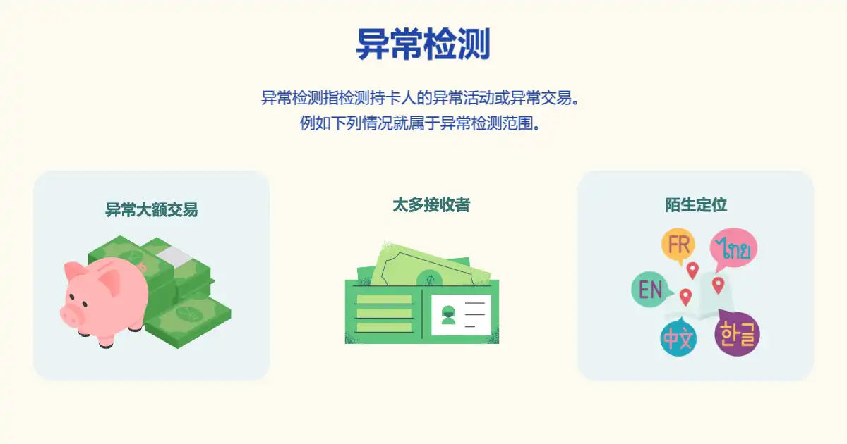 例如,如果持卡人通常使用该卡在当地商店进行小额交易,但突然在另一个国家的在线零售商处进行大额交易,系统就会将此交易标记为异常交易。